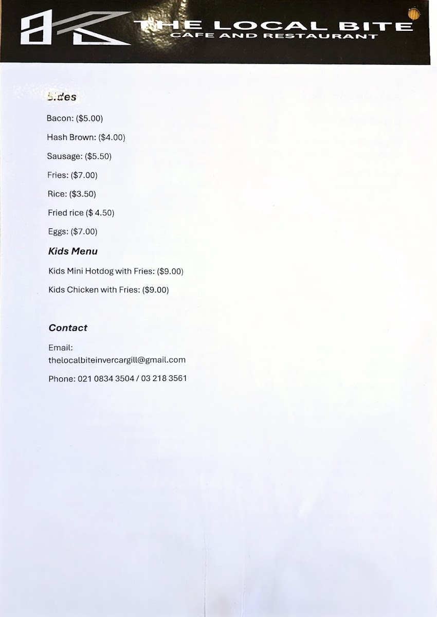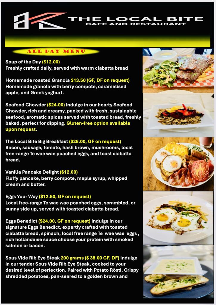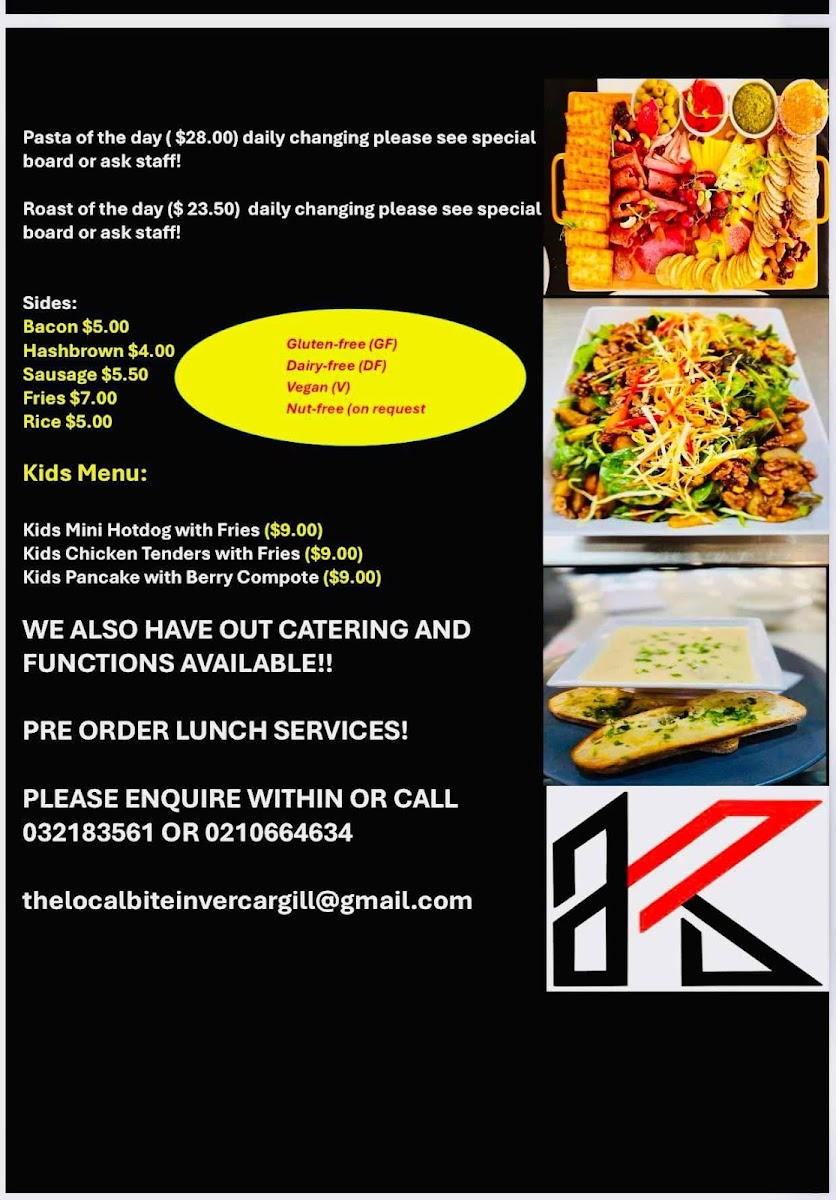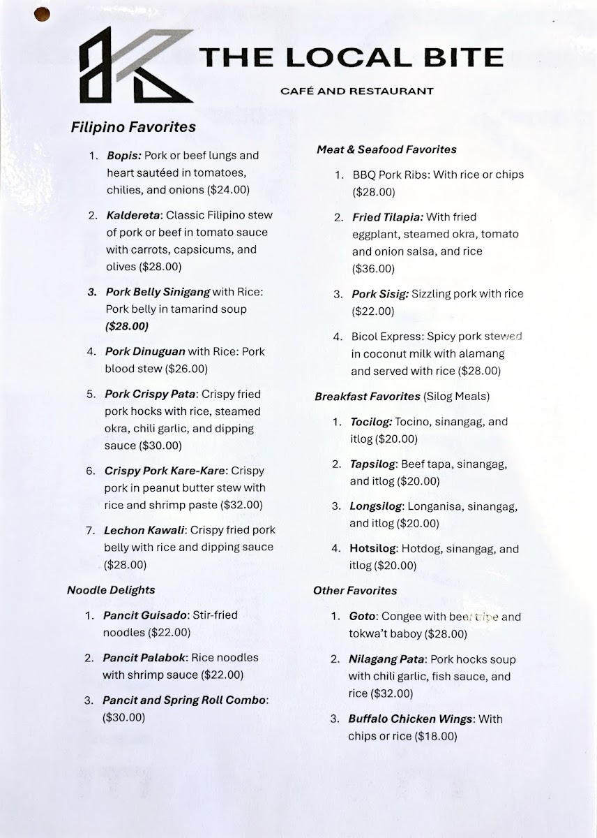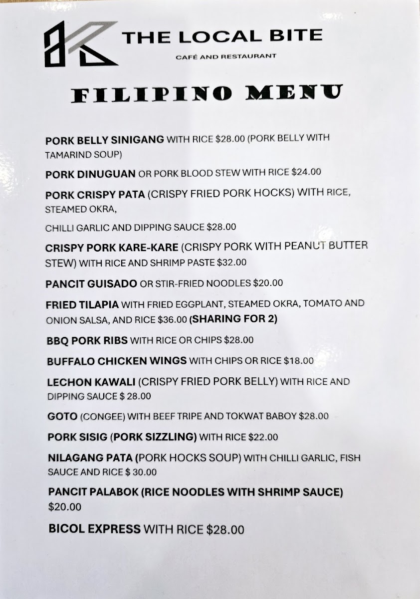 The menu offers a variety of Filipino and local dishes alongside cafe-style beverages, suitable for breakfast, lunch, and casual dining. Food options include savory pies such as Butter Chicken Pie and Pork Belly Pie, traditional Southland Cheese Rolls, and classic Filipino dishes like Chicken Caesar Salad, Chicken Parmigiana, Creamy Chicken and Corn, Seafood Chowder, Fried Tilapia, and The Local Bite Cheese Scone.